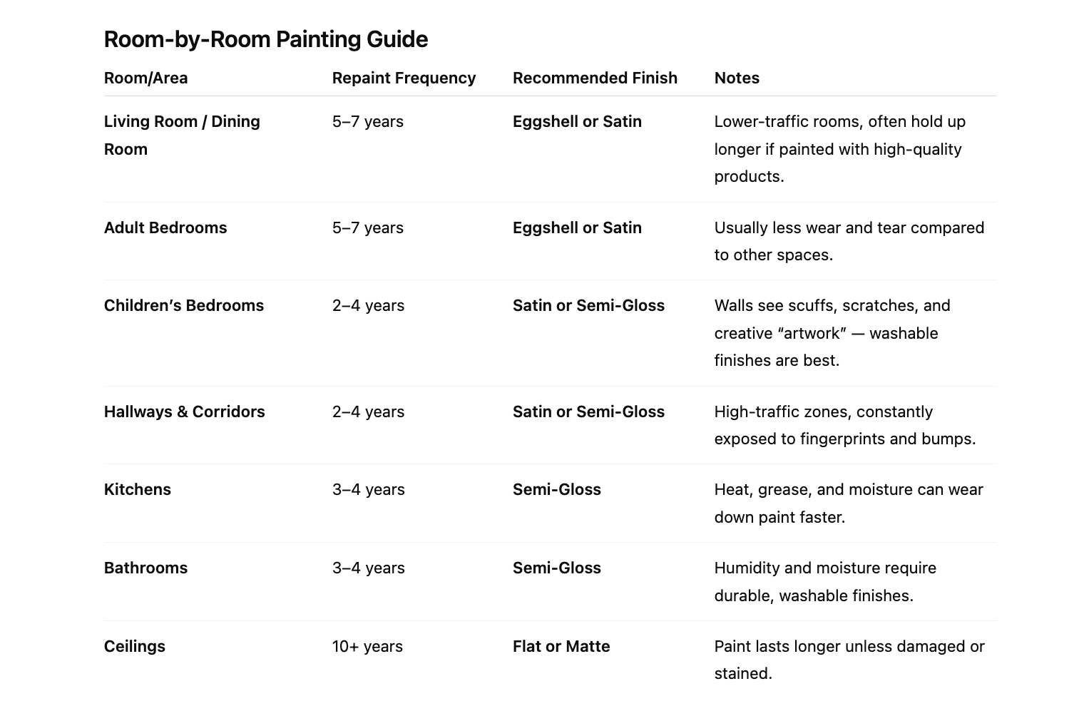 These spaces are usually painted with higher-quality finishes, so they hold up well. If the area doesn’t see much wear and tear, you can stretch the timeline toward the longer end.Bedrooms (5–7 years for adults, 2–4 years for kids’ rooms)